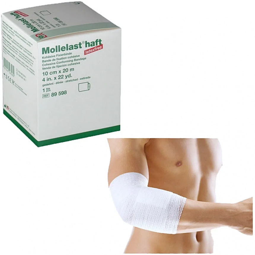Mollelast® é uma bandagem coesiva conformável com duplo estiramento no sentido longitudinal e transversal que proporciona um bom ajuste nos membros de forma cônica, retendo os curativos firmemente, inclusive sobre articulações. É composta de viscose e poliamida, livre de látex, com fina tricotagem que a torna permeável ao ar e não prejudica a pele. O acabamento coesivo faz com que a bandagem adira em si mesma a cada volta, mas não à pele nem aos pelos, dispensando o uso de fixação para prendê-la. Mollelast® é indicada para fixação de curativos e cânulas e/ou para fins de compressão.